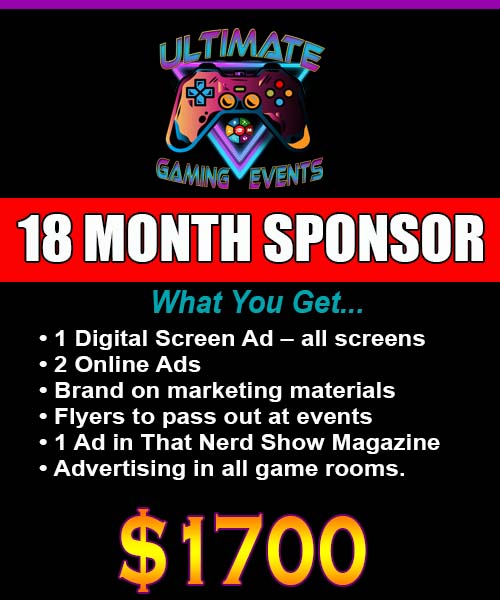 We put your brand on all the banners we hang at events. We put your ads on our digital screens next to our gaming equipment. We put your Ad / Brand on all marketing materials. You can also advertise with another Truesource company, That Nerd Show, a media outlet based in Dallas / Ft. Worth, but also has a national audience. This includes an AD in That Nerd Show’s digital magazine. You will also get online advertising on our websites, www.ultimategamingevents.com, and www.thatnerdshow.com. You get three forms of advertising and the promotion of your brand. Please see our packages.